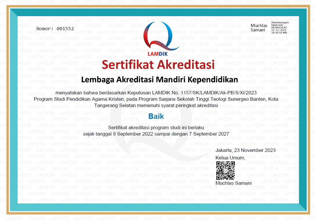 Kiranya dengan ketaatan terhadap regulasi dan sesuai dengan standar pemerintah, STT Sunergeo Banten dapat terus berkarya dalam misi Amanat Agung Tuhan Yesus, khususnya dalam ranah pendidikan. Amin!